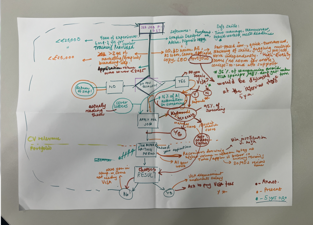 Finally, the algorithm research brings to light the obstacles that define the so-called ‘Easy-Apply’ process of applying for a job through online job-postings – like the overuse AI to screen applications that even ‘potential’ hires don’t make the cut based on technicalities, or the complications that arise when there is a need for visa sponsorship, and how the demands and duties for an entry-level job are ever-expanding while pay for the same role remains unchanged in a cost-of-living crisis.