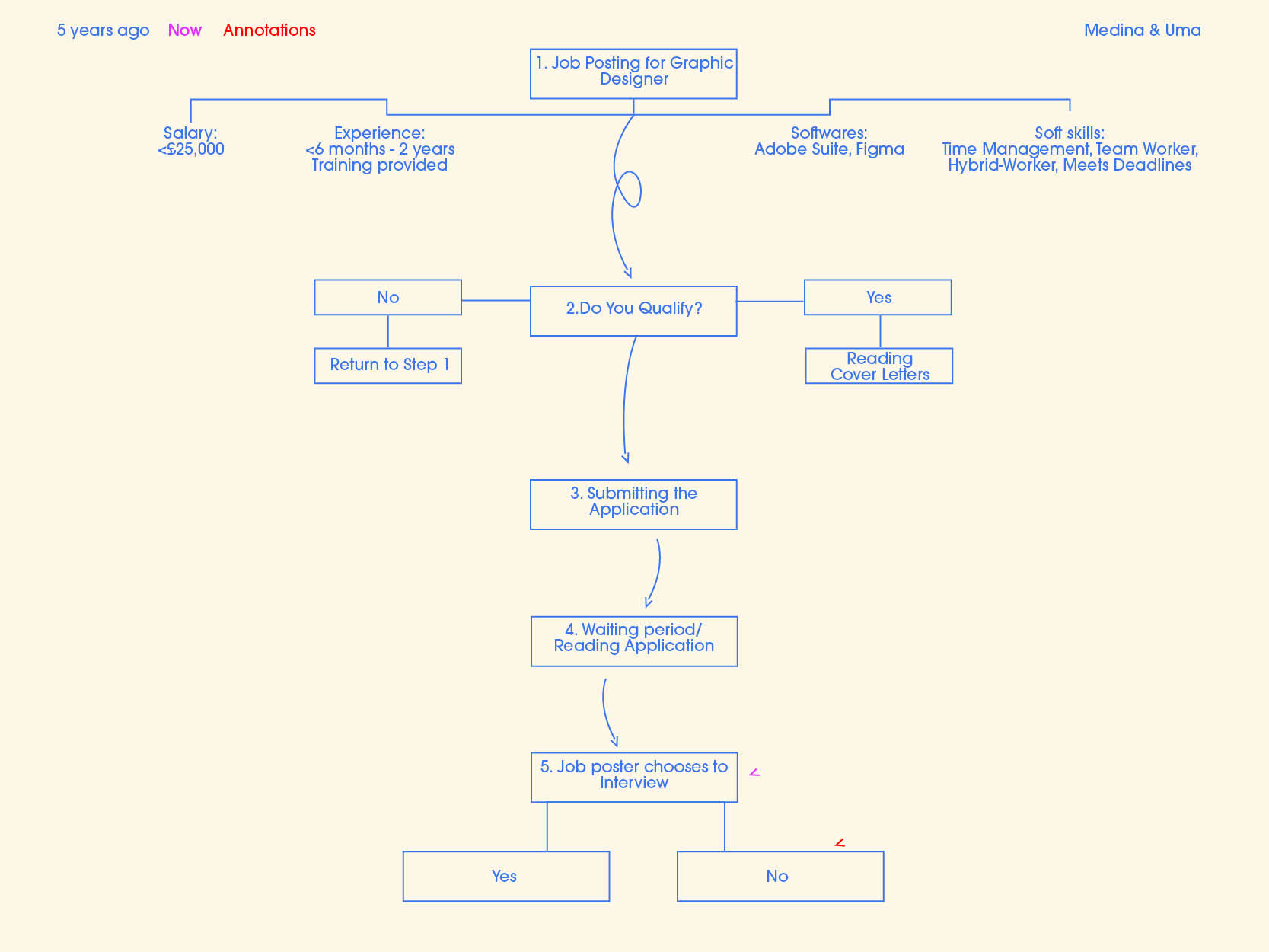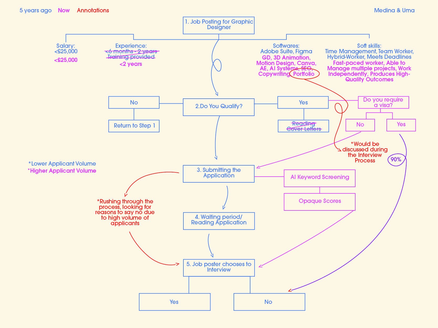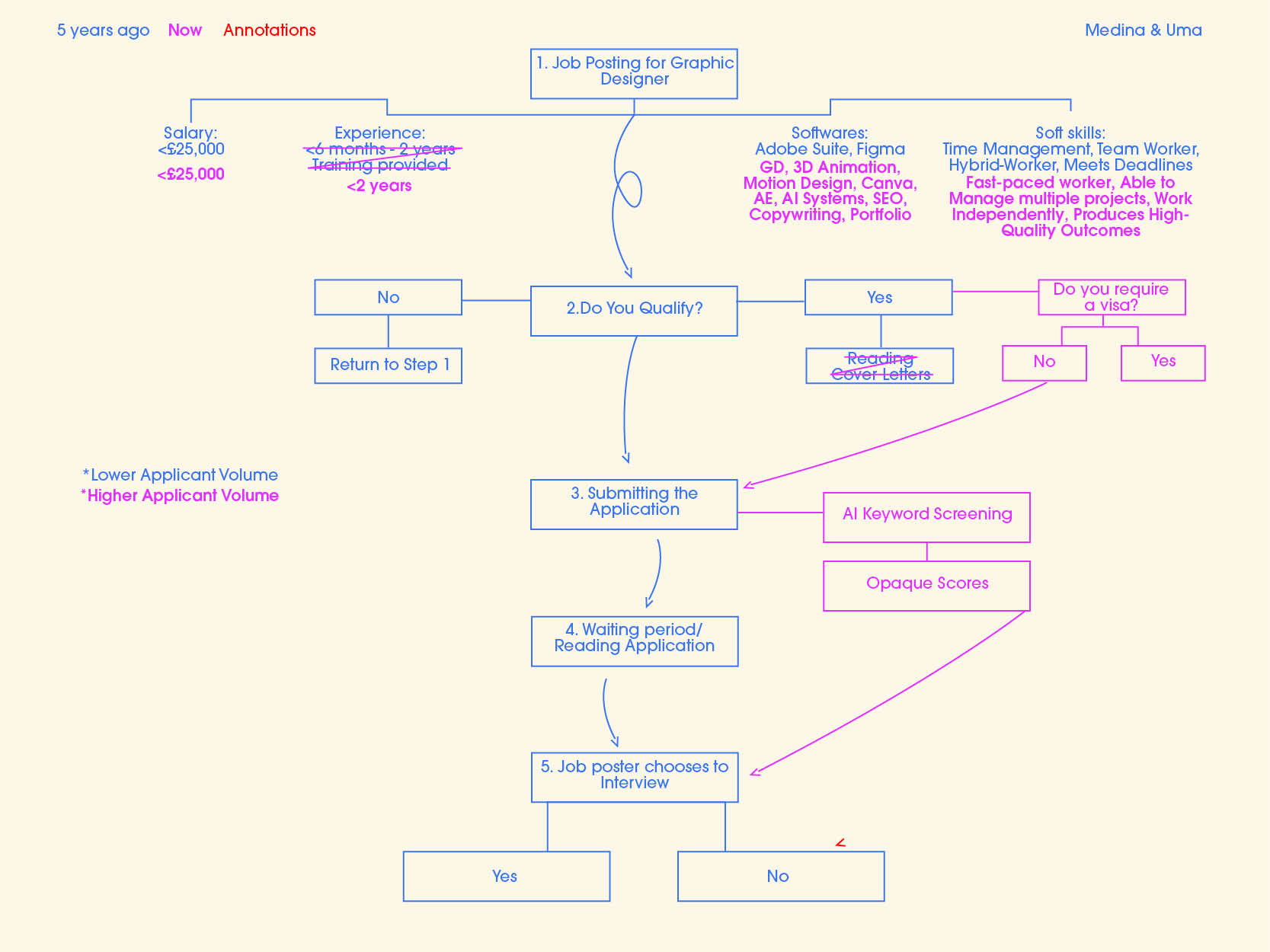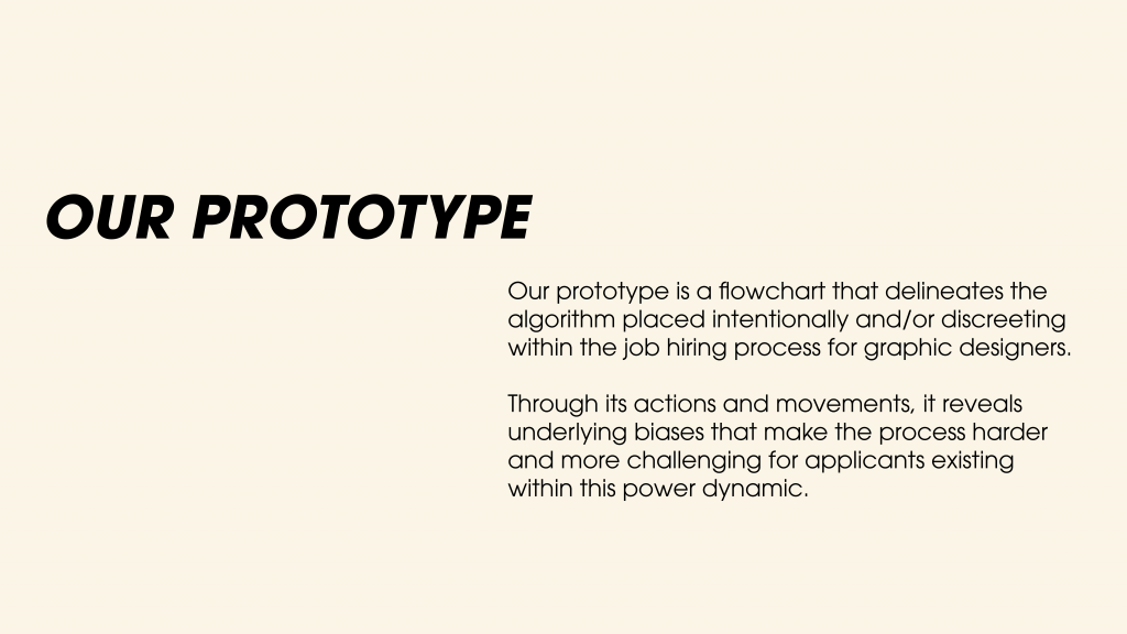 For our enquiry, we decided to explore the algorithms, both obvious and discreet, that dictate the pathway to land an entry-level job as a graphic designer, and how the algorithm has been modified over time. Using statistical data and personal experience and existing job postings as data points, we chose a data-visualization to represent the info.