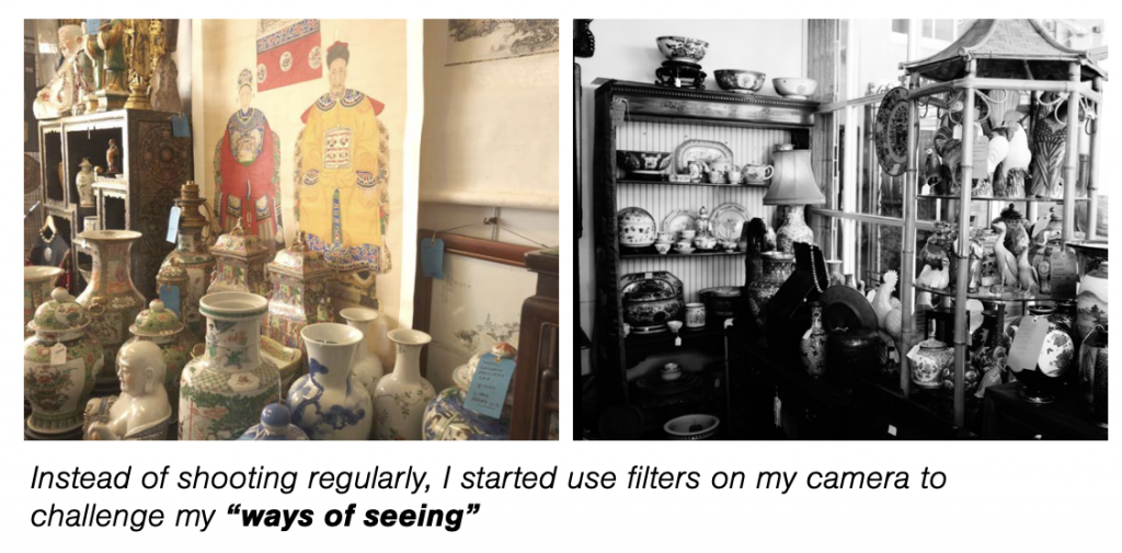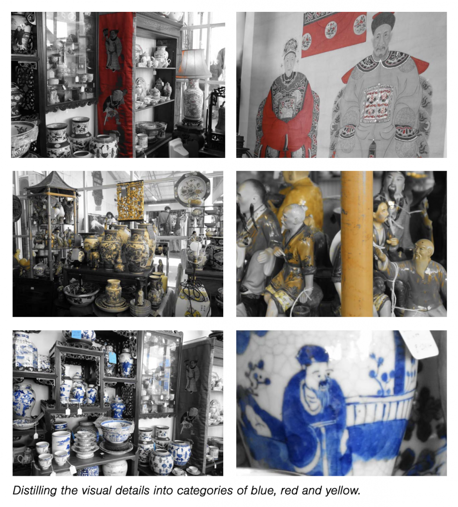 In the antique market was a display of china, saturated with antique glazed porcelain and opaque colour pigments. How do you sort what you’re seeing in a busy room? I tried photographing them with B&W filter only selectively choosing colour, and sorting them in primary colours.