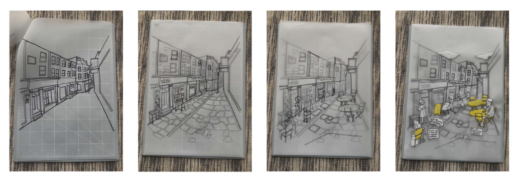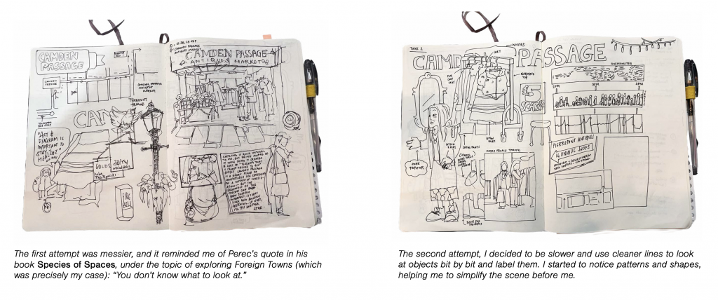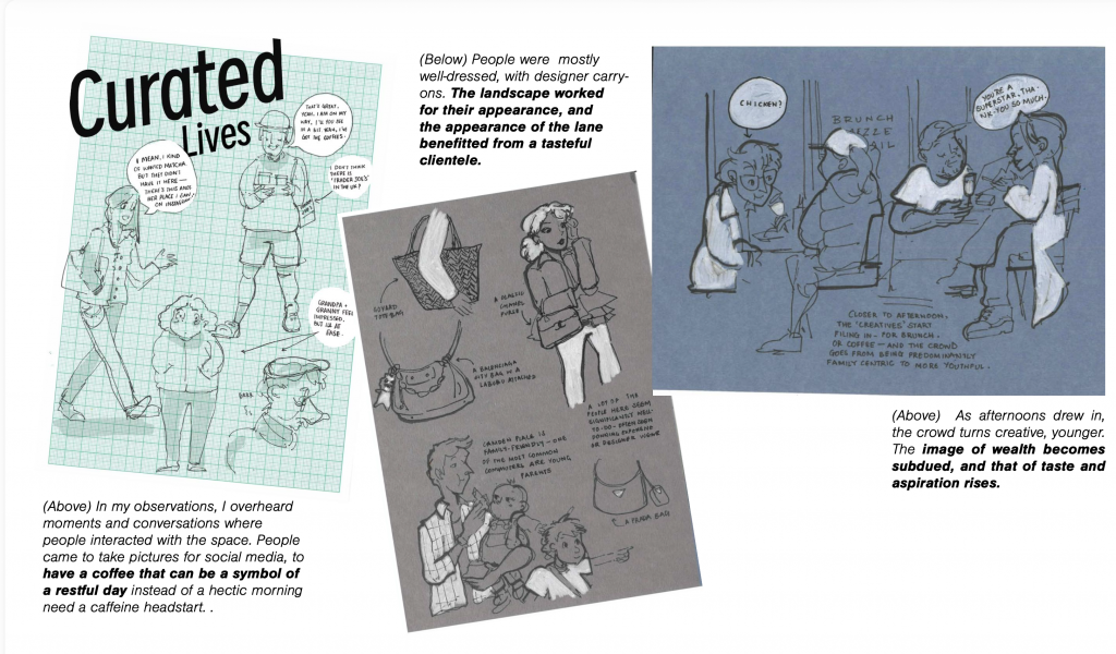 In the first drafts, I used sketching and collage as a form of reportage illustration to create new landscapes of the area. Wandering through the area during the quiet and peak hours, deconstructing different elements that composed the space as a whole, it observed of how space was being used – who occupied it, for how long and why. For this iteration, I kept the sketches loose and fast to capture moments and motion – and focussed on a part of the length of the lane instead of the antique store itself.