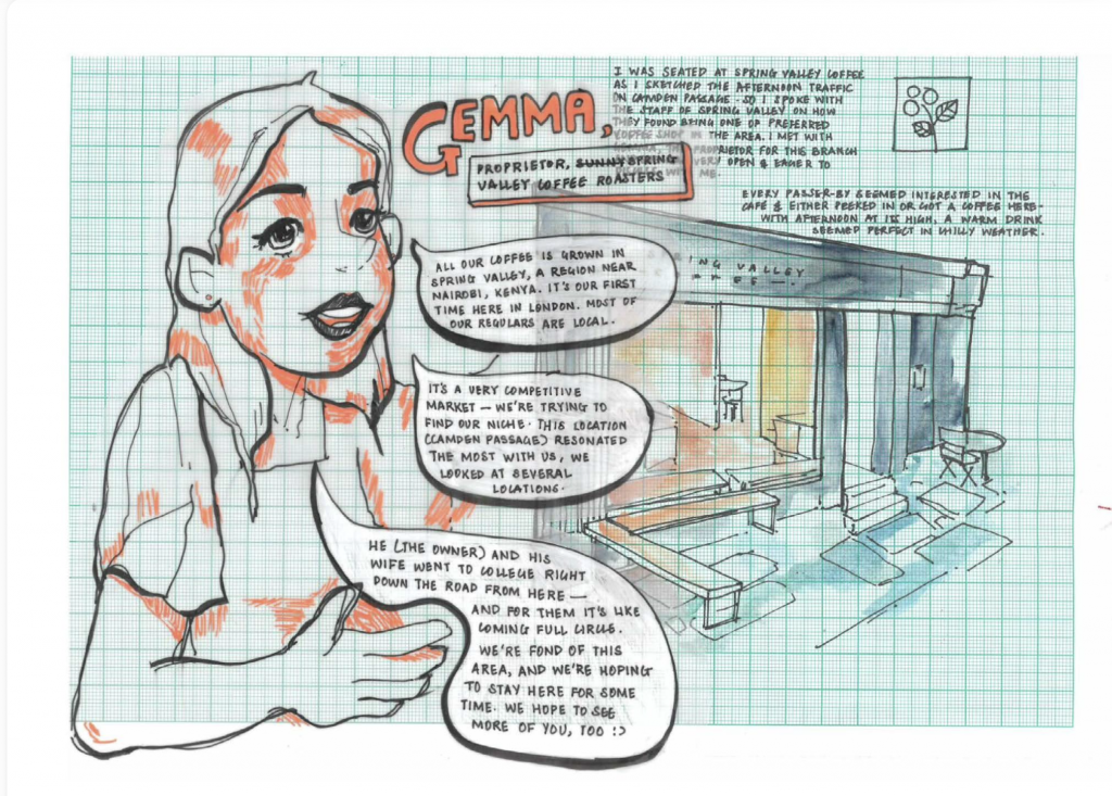 To conclude my set of illustrations, I wanted a peek into the life of an every-day commuter of Camden Passage, someone who is backstage, running the show. Gemma, the kind proprietor of the cafe from where I sat and sketched, offered some insight.